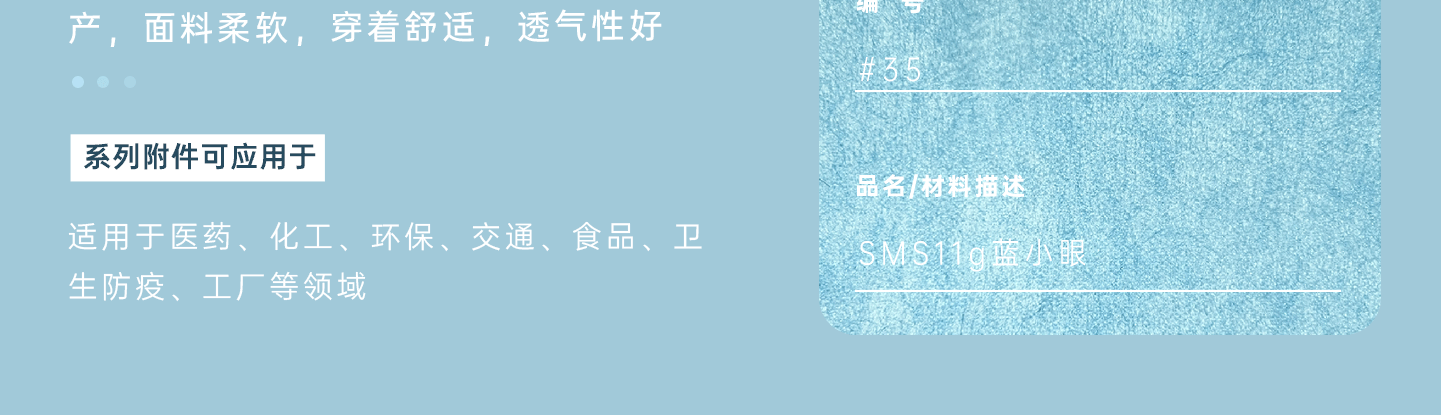 主要成分:聚丙烯 克重:11g 顏色:藍色 產(chǎn)品用途:該款布料為紡粘聚丙烯無紡布,可提供優(yōu)異的液體和防塵保護,可用于圓帽生產(chǎn),面料柔軟,穿著舒適,透氣性好