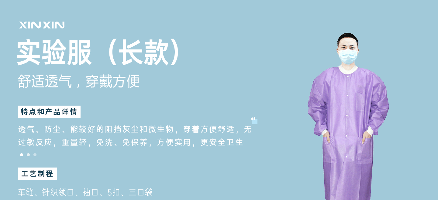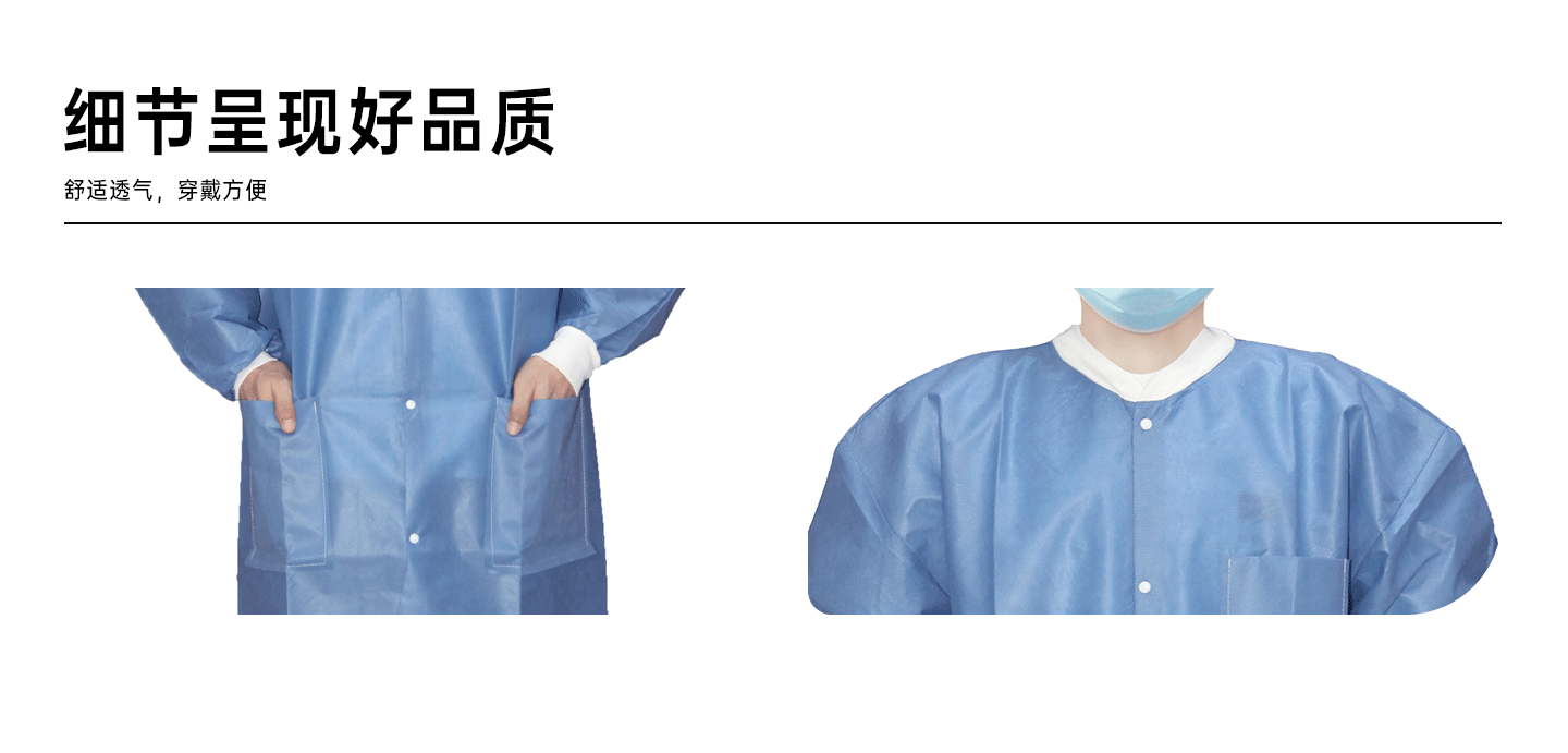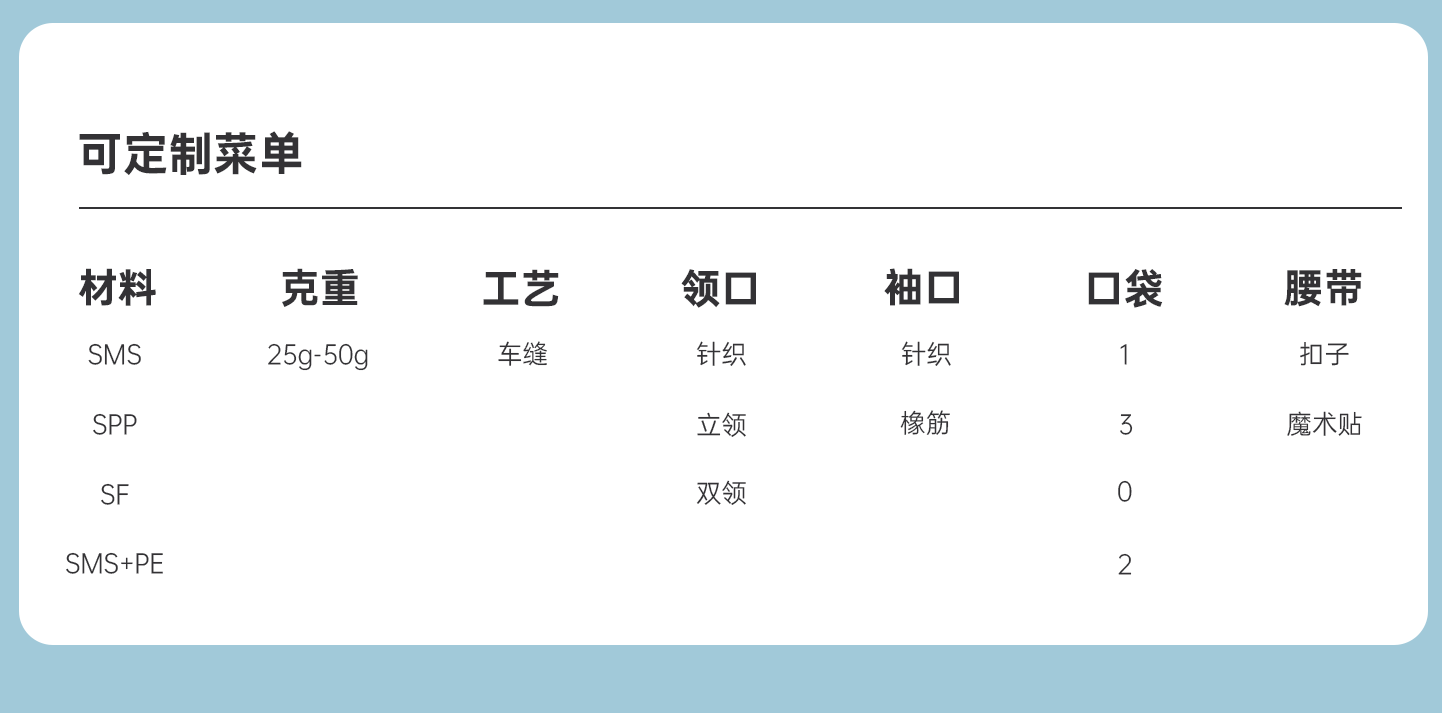 規(guī)格尺寸:S~2XL 主要成分:聚丙烯 克重:25g-50g 顏色:白色、藍(lán)色、深藍(lán)、淺藍(lán)、紫色 工藝:車縫、針織領(lǐng)口、袖口、5扣、三口袋 包裝:10件/袋 10袋/箱