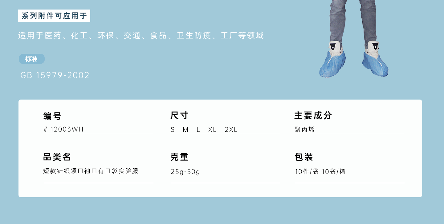 規(guī)格尺寸:S~2XL 主要成分:聚丙烯 克重:25g-50g 顏色:白色、藍(lán)色、深藍(lán)、淺藍(lán)、紫色 工藝:車縫、針織領(lǐng)口、袖口、5扣、三口袋 包裝:10件/袋 10袋/箱