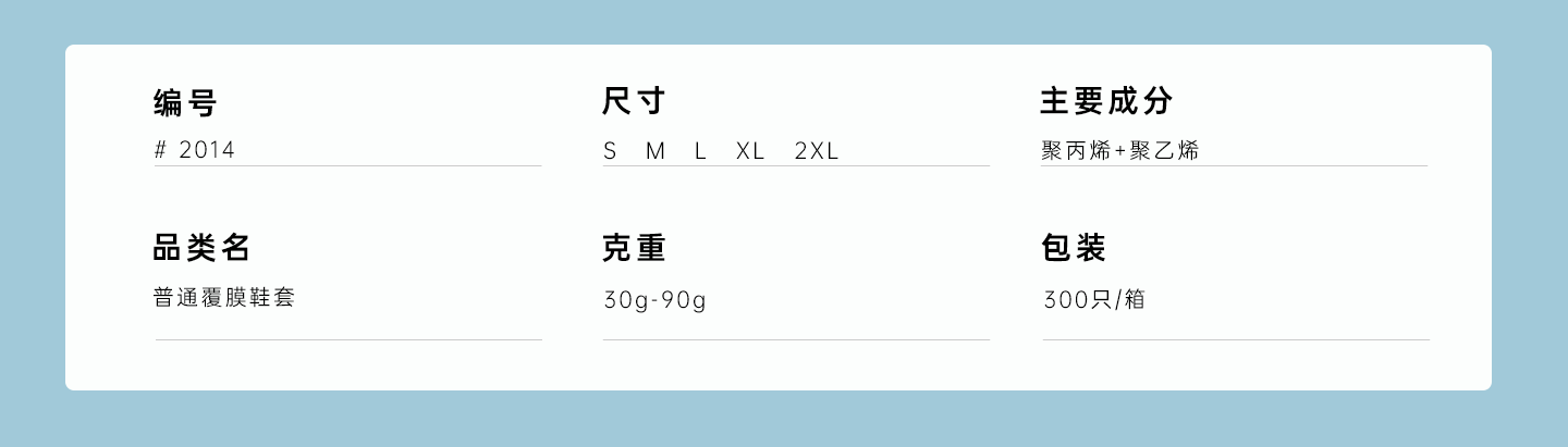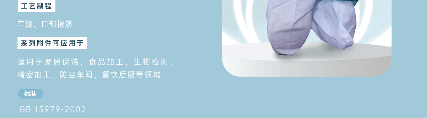 規(guī)格尺寸:S~2XL 主要成分:聚丙烯+聚乙烯 克重:30g-90g 顏色:白色、藍色、深藍、淺藍、紫色 工藝:車縫、口部橡筋 包裝:300只/箱